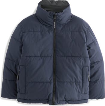 Comfy quilting and a generous stand collar enhance the cozy feel of this kid-size puffer jacket minimally branded with a tonal logo at the back hem.