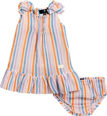 A smocked front and bow-adorned shoulders add sweet style to a ruffle hem dress crafted from pure cotton.