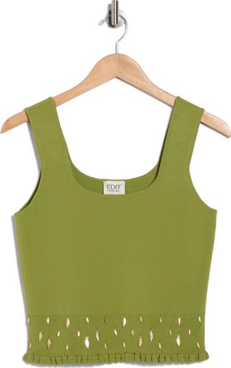 A smocked hem is embellished with sparkly goldtone leaves on this chic cropped tank.