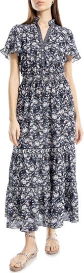 A smocked waist defines the silhouette of a maxi dress finished in a bold pattern for eye-catching appeal.
