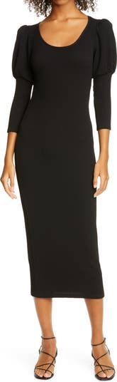 A sleek silhouette emphasizes the softly puffed Juliet sleeves on this ribbed body-con dress.