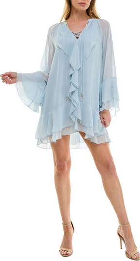 Tiered ruffles and bell sleeves dial up the retro drama of this statement-making minidress.