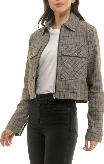 Handsome plaid and tailored finishes inspired by your favorite menswear garment distinguish a trucker jacket updated with a boxy fit and cropped length.