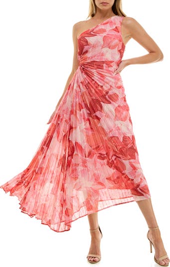 Add a shot of sizzle to your flower-powered dress options with a one-shoulder frock swirled in sunburst pleats and finished with an off-center hem. A cute circle cutout at the side waist completes the party-ready look.