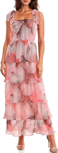 Tiers of impeccable pleats add an extra dimension of sophistication to a sleeveless dress in a dynamic floral print.
