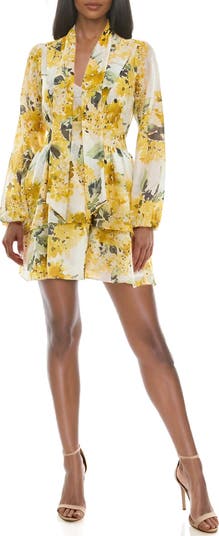 A smocked waist shapes the silhouette of this flowery mini framed by billowy sleeves and punctuated with swingy tiered ruffles.