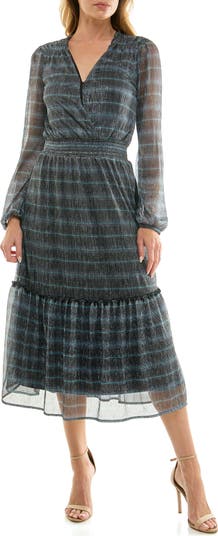 Shimmery metallic threads bring understated glamour to a long-sleeve midi dress balancing a graceful faux-wrap bodice with a tiered skirt and side pockets.