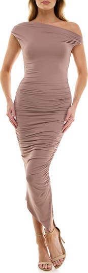 Give your curves a hug in this one-shoulder body-con dress featuring ruched sides and an asymmetric hem.