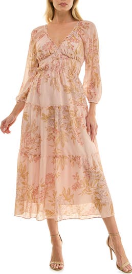 Swiss dots and a tiered skirt lend dimensional play to a woven midi dress that gives off an ethereal elegance to enchant your audience.