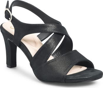 Cushioning at the ball, heel and arch lends cloud-like comfort to this strappy leather sandal ready for the dancefloor.