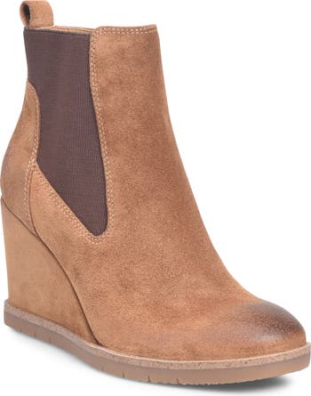 Stretchy side panels and a rear pull-tab lend easy wear to a trend-savvy Chelsea boot lifted by a wrapped wedge heel for a contemporary aesthetic.