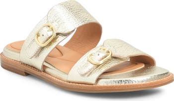 Adjustable straps lend easy wear to a leather slide sandal grounded by a cushioned footbed for lasting comfort.