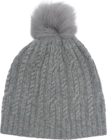 A super soft cashmere beanie features a cable knit texture and a genuine shearling pompom.