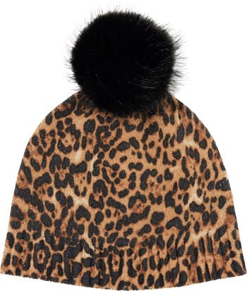 A fuzzy faux fur pom tops this fierce leopard print beanie crafted from luxe lurex blended cashmere.