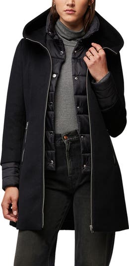 Create a layered look but skip the bulk with this hooded, wool-forward coat that features a quilted bib insert and inset cuffs.