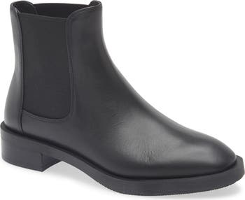 A modest round toe and flexible sole balance a leather Chelsea bootie fashioned with stretchy gore insets for easy entry.