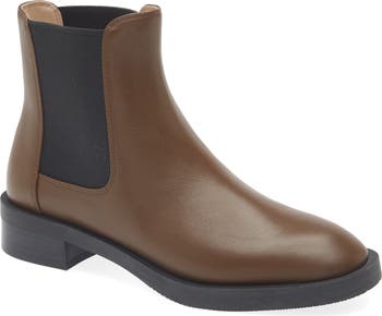 A modest round toe and flexible sole balance a leather Chelsea bootie fashioned with stretchy gore insets for easy entry.