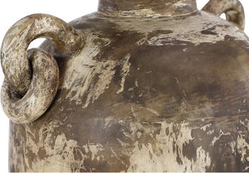 Complete your rustic or farmhouse look with this 15" x 28" centerpiece ceramic floor vase, handmade in Indonesia. Its urn silhouette tops off with a tall, wide neck and rim, perfect for displaying gathered branches, ferns, or long-stemmed flowers. Extra adornments include the ceramic looped handles featuring ceramic O-rings. The matte cocoa brown, soft beige, and other neutral tones with heavy textural distressing and brush strokes make this large vase a bold addition to your rustic decor. - Color: beige - 15" x 15" x 28" - Imported Orders cannot be shipped to Canada, Alaska, Hawaii, Puerto Rico or P.O. Boxes.