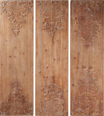 Handcrafted in India from 100% Chinese fir wood, this ornately-carved wood wall decor is comprised of 3 large wood panels, each with hand-carved antique frame, festoon, and acanthus designs at the tops and bases. The natural light and mocha brown hues against the natural wood grain of the Chinese fir wood bring rustic warmth, adding an earthy touch to your space.