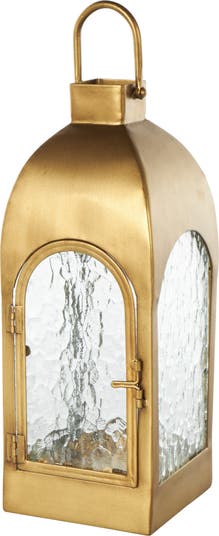 Enhance the ambiance and illuminate your space with this pebbled glass and smooth metal candleholder lantern.