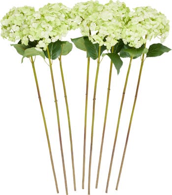 A delicate cluster of pastel petals forms these timelessly beautiful faux hydrangea blossoms. This set of eight stems, each with an elegant length, brings a touch of brightness to your favorite vase and room.