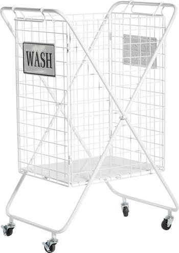 Add Farmhouse style to your home organization with this large white metal rolling laundry hamper, featuring black and white metal "WASH" signs on each side. Rounded metal handles across the top allow for easy push/pull movement in addition to the 360-degree rolling caster wheels for a smooth glide. The neutral white color is bright and clean and will work with any color palette.