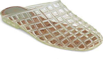 A woven jelly-like upper lends throwback appeal to the vamp of a mule set on a cushioned footbed for increased support.
