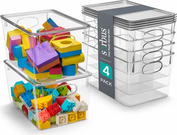 Keep toys, clothing or household items organized with this set of nesting clear plastic storage bins featuring built-in handles and removable lids.