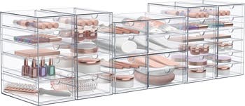 Declutter your bathroom or vanity space with this helpful organizer with a customizable and stackable design.