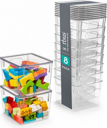 Keep toys, clothing or household items organized with this set of nesting clear plastic storage bins featuring built-in handles and removable lids.