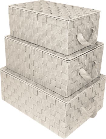 - - Color: Beige - 13.5" x 8.75" x 6.87" - Imported Set includes: - Large: 17’’ L x 12’’ W x 7’’ H - Medium: 15.50’’ L x 10.25’’ W x 6.50’’ H - Small: 14’’ L x 7.75’’ W x 5.62’’ H