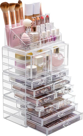 Whether you’re a beauty beginner or glam guru, you now have a place to display your essentials. This large 4-piece makeup organizer by Sorbus is a stylish way to store your beauty collection. It features twelve drawers total (both small and large) with a sleek clear view. The top tray compartment includes sixteen slots, perfect for dividing your makeup brushes, lipsticks, perfume bottles, skincare, and more. With an interchangeable design, this entire unit can remain stacked together or separated to spread out your collection. Don't limit your imagination to beauty needs! Grooming tools, jewelry, and other personal accessories can be beautifully organized within this storage case. Your beauty routine (and countertop) will thank you! - Color: clear - 4-piece set - Spacious drawer design - Great for bathroom counter, dresser, vanity organization - 15.75" x 9.25" x 5.5" - Imported Orders cannot be shipped to Canada, Puerto Rico, APO, FPO or P.O. Boxes.