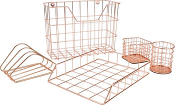 - - 5-piece set - Color: Copper - Imported Set includes: - Pencil Cup Holder: 3.50" x 4" - Letter Sorter Divider: 7.5" x 4.75" x 3.75" - Letter Tray: 12" x 9.75" x 2.25" - Hanging File Organizer:13" x 5.5" x 9.25" - Sticky Note Holder: 4" x 4" x 3.25" Orders cannot be shipped to Canada, Puerto Rico, APO, FPO or P.O. Boxes.