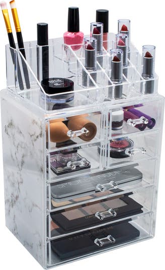 Tired of rummaging through dresser drawers, purses, and bags trying to find your favorite beauty item? Make your life a little bit easier with Sorbus® Acrylic Cosmetic and Makeup Storage Case Set that organizes all your favorite makeup essentials into your own makeup and cosmetics beauty counter! The 2-piece set interlocks when stacked together to fit properly and securely and easily detaches to be used separately. It features removable black mesh padding that keeps makeup items protected and in place. The organizers feature handles that slide the drawers in and out smoothly making these drawers completely removable for ease of use. We have created a set that is sure to organize your favorite makeup essentials into a dazzling makeup set. Drawers are perfect for storing lipsticks, foundations, bronzers, blushes, eye shadows, primers, powders, and much more! I know...what a great space and time saver! The stylish and modern acrylic storage case adds refinement to any makeup collection. It brings convenience and functionality by always being able to see your makeup right when you need it. Turn all your loose makeup and cosmetics into your very own beautiful beauty counter. This makeup storage case can be conveniently stored in bathrooms, vanity counters, dressers, and most tabletops. This storage case is made of acrylic which is a clear plastic that resembles glass but is much stronger and safer than glass. It has a transparent case allowing you to easily find whatever you need. This holder is suitable for home or professional use. Also a great gift for any makeup lover! Makeup and brushes are NOT included.