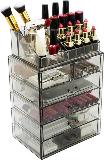 Tired of rummaging through dresser drawers, purses, and bags to find your favorite go-to items? Find beauty in organization with the Sorbus® Acrylic Cosmetic Makeup and Jewelry Storage Case. It features acrylic construction to store your makeup and jewelry with an effortless view. Four drawers on the bottom unit are ideal for oversize cosmetics, toiletries, and grooming tools, while the top two drawers hold smaller items. It also includes 16 slots on the top portion to keep items such as brushes, lipsticks, eye pencils, and perfume bottles protected, upright, and in place. Drawers are perfect for storing palettes, foundations, bronzers, blushes, primers, powders, jewelry, accessories, keepsakes, and much more! Turn your collection into a functional and stylish display with an acrylic storage case, perfect for home or professional use. Add a chic display to your dresser or countertop while bringing ease and convenience to your everyday routine. For convenience, you'll always see your products right when you need them most. Turn your loose makeup into your very own beauty counter or use this case as a jewelry box to complete your look from head to toe! This storage case can be stored in bathrooms, closets, vanity counters, dressers, and most tabletops. The clear acrylic construction helps you find your items instantly, saving you valuable time during a busy morning rush. Made of acrylic which is a clear plastic that resembles glass but much stronger and safer. It includes 4 large drawers, 2 small drawers, and 16 slots. Drawers slide open smoothly and handles are easy to grip. Makes the perfect gift for any makeup lover, from beginner to guru! Makeup NOT included. Ditch clutter, not your shopping obsession! Add storage for all your beauty and fashion essentials.