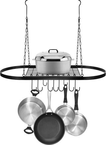 Mounts on ceiling to store, organize, and display cookware collection in one compact space. Ideal for any home or restaurant kitchen. Specially designed to hold pots, pans, utensils, cookbooks, bakeware, plants, and other decorative pieces. A great way to showcase a stylish kitchen. Top grid shelf keeps kitchen pots and pans within easy reach on flat surface and hooks keep utensils and other cookware hanging vertical for customized organization. Hooks can be repositioned on the grid or rim in any pattern to fit needs. Great for everyday meal prep, hosting dinner parties, events, holiday gatherings, and more. Eliminates clutter, frees cabinet space, and protect against scratches. Saves time and hassle of searching through cabinets and countertops. Built-in shelf provides added cupboard space and plenty of room to store essentials. Space-saving oval shape frame provides easy access for tight spaces and convenience for limited storage. Great for condominiums, tiny apartments, studios, small kitchens, or anywhere with limited storage space. Suitable for various types of storage. Install in kitchen, pantry, dining area for everyday cookware or bathroom to store drying towels and toiletries. Also suitable for study, office, or walk-in closet. Sturdy center grid does double duty and functions as shelf for books, baskets, toiletries, plants, and many other household items. Minimal assembly required with quick set-up. Package includes grid rack with 2 hanging chains, 10 pot hooks, and mounting hardware. Beautiful oval frame for stylish look. Complements most light fixtures, appliances, cookware, and design interiors. - Color: black - Mounting hardware included - 23.25" L x 16.5" W x 21" H - Imported Orders cannot be shipped to Canada, Alaska, Hawaii, Puerto Rico or P.O. Boxes.