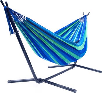 Go on a tropical vacation at home when you add this contemporary striped hammock to your space.