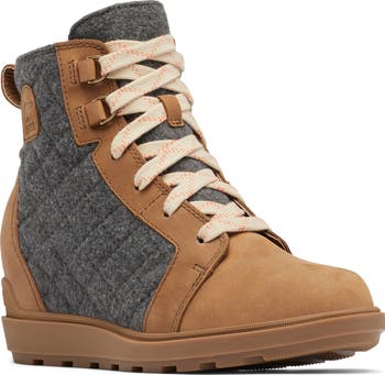 A hidden wedge boosts this water-resistant bootie featuring a mixed-media upper set soundly on a molded rubber sole.