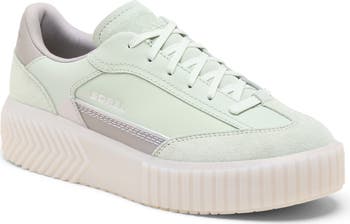 Give your look a little lift with this foiled-logo leather sneaker layered with suede panels and set upon a chunky platform textured with chevron crenellations.