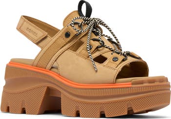 Lace-up leather straps amplify the summery appeal of a slingback sandal accented by a gleaming D-ring and grounded by a walkable lugged sole.