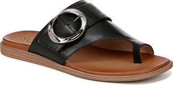 A well-cushioned footbed puts lasting comfort in every step of a bold sandal finished with a gleaming buckle at the vamp.