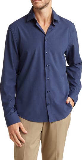 Refresh your essentials with this solid button-up sport shirt constructed from stretchy microfiber for superior comfort.