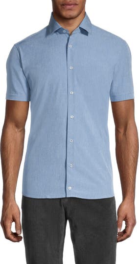 Lightweight microfiber adds breathable comfort to this classic button-down shirt framed by short sleeves.