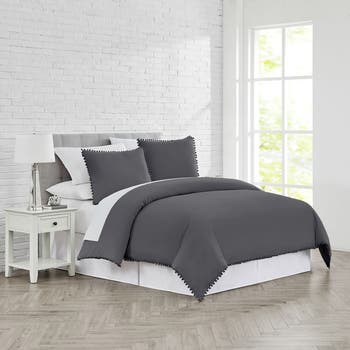 Classic duvet cover set with Beautifully decorated pompom trim. Fabric has been specially pre-washed in the factories for extra softness and the classic vintage look. Zipper closure and corner ties to hold your insert in place.