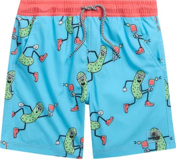 Pickleball-playing vegetables bring a dose of whimsy to swim trunks cut from lightweight, quick-dry fabric to comfort their movements from surf to sand and beyond.