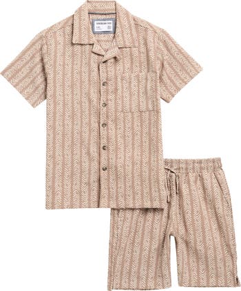 Effortlessly cool and coordinated, this camp shirt and shorts set features a textured geometric weave for a look made for fun in the sun.