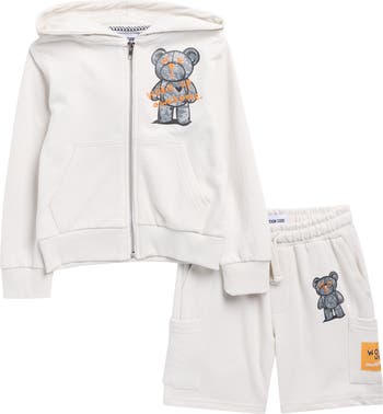Your kiddo will stay comfy in this cotton-blend zip hoodie and shorts set featuring a teddy bear graphic.