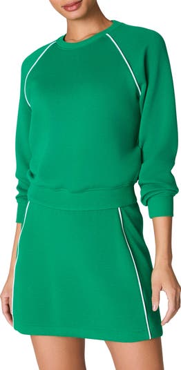 Contrast stripes add style points to a sporty sweatshirt mostly made from feel-good fibers.