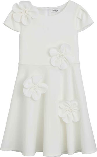 Bold dimensional flowers bring kid-approved style to a flowy skater dress cut from a stretchy scuba knit.