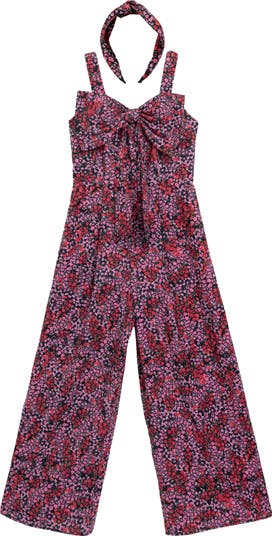 Dress them up in a snap with this sweet floral jumpsuit complete with a front-and-center bow and a matching knotted headband.